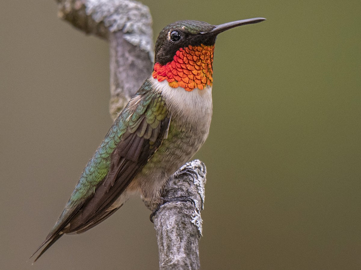 Small hummingbird found in a variety of woodland and brushy habitats. Male distinctive with ruby-red throat and black chin. Female has whitish underparts with almost no buffy tones (perhaps a very light wash on flanks). Readily comes to sugar water feeders and flower gardens. Default summer hummingbird over most of eastern U.S. and Canada. Winters south to Panama. Very difficult to distinguish from Black-chinned Hummingbird, especially females and young males; thankfully limited range overlap. Ruby-throated averages somewhat brighter green above, shorter- and straighter-billed, and has slightly narrower outer wing feathers, but these differences are all extremely subtle. From ebird